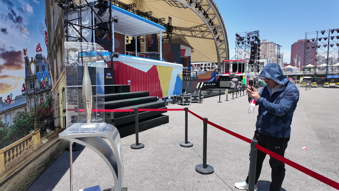 在黄浦滨江的奥运资格系列赛·上海的场地内,展示了2024年巴黎奥运会火炬,吸引众多市民拍照。