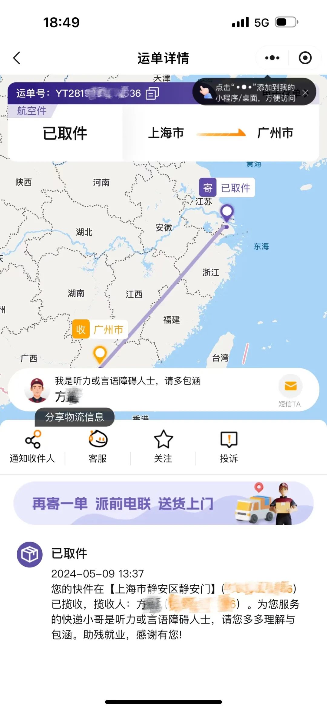 如果为消费者服务的是听力或言语障碍快递员,消费者在微信小程序上查询包裹物流轨迹时,系统会告知当前为其服务的快递员身份信息,以便取得理解。当客户联系这些快递员时,“电话”选项会默认关闭,并建议消费者与快递员通过短信沟通。