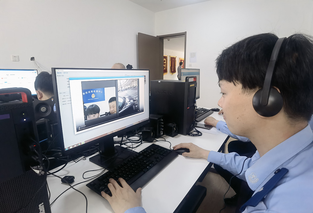 “麻烦两位驾驶员站在一起拍一下。”“碰撞的部位麻烦拍一下。”10时07分,南京西路近镇宁路口发生一起两车碰擦事故,民警(辅警)戴着耳机在电脑前与视频那头的事故驾驶员沟通,引导驾驶员拍摄现场碰撞情况,远程取证。核实完两位驾驶员的信息后,民警(辅警)提醒两位驾驶员取证已完成,尽快安全撤离现场,双方手机将在15分钟内收到事故定责的短信。自事故发生到双方撤离现场,共用时6分钟。(具体情况根据现场案例调整)