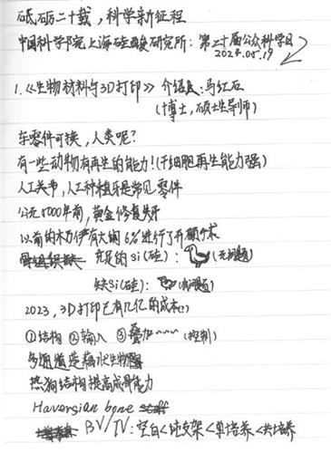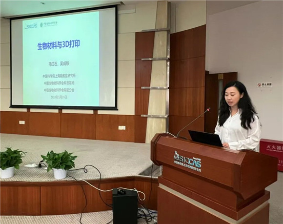在致欢迎词后,研究所领导向学生代表们赠送了《科学家传记》一书,并邀请了生物材料与组织工程研究中心的马红石副研究员作科普报告《生物材料与3D打印》。马老师先以“修车”和“修人”的话题迅速吸引了同学们的注意,随后介绍了目前她们团队在促进组织再生方面的研究进程,目前该研究项目可以用3D打印的各种材质、造型来帮助人体或动物的组织再生,后续会在人体器官再生中进一步研究。在随后的提问环节中,同学们积极发问,让好奇心、求知欲得到了满足。