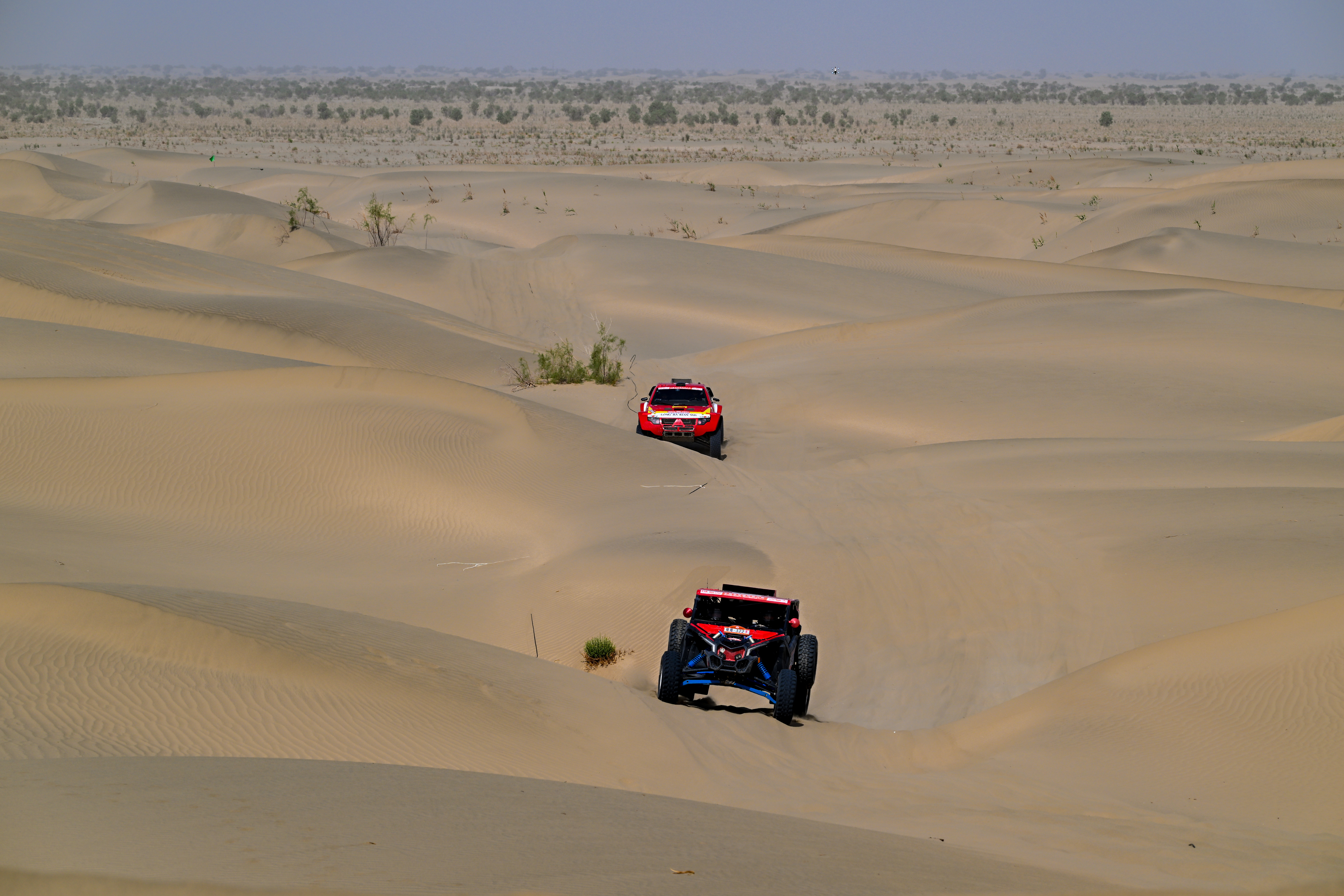 5月22日,黑龙江龙嘉先越拉力艺车队车手汪海和领航员徐宝满(上)、呼伦贝尔苍狼白鹿车队车手乌力吉木仁和领航员张行涛驾驶赛车在比赛中。新华社记者 戴子鸾 摄