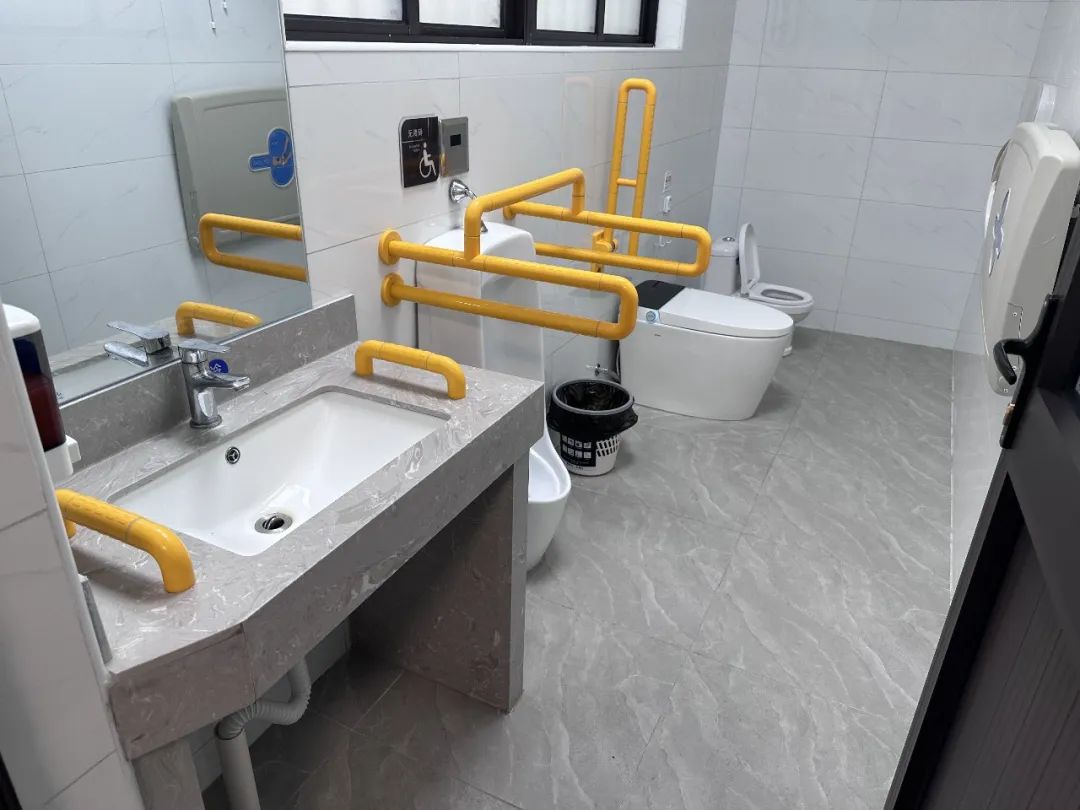 这次改造不但对原先的男厕布局进行了更改,将男士小便池位置改造成了第三卫生间,还从视觉环境着手,通过优化照明系统,提升厕所内的视觉观感度。这些举措不仅可以防止老年人在光线过暗的环境下摔伤,还能避免因光线过强而产生的眩晕感,确保老年人在使用公厕时的安全与舒适。