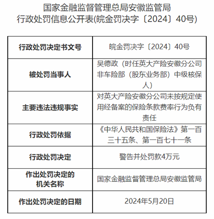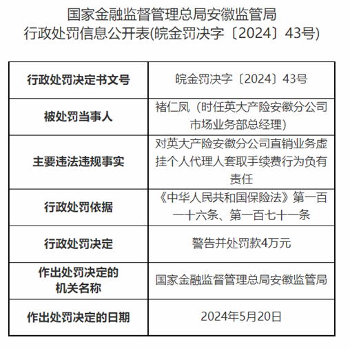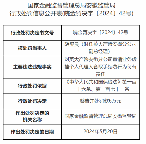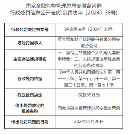 因业务虚挂代理人套取费用等,英大泰和财险安徽分公司被罚39万