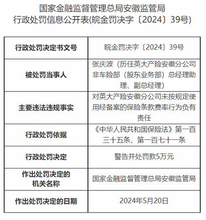 因对未按规定使用经备案的保险条款费率事项负有责任,对时任安徽分公司非车险部总经理助理、副总经理张庆波进行警告并处罚款5万元处罚;对时任安徽分公司非车险部中级核保人吴德政进行警告并处罚款4万元处罚。