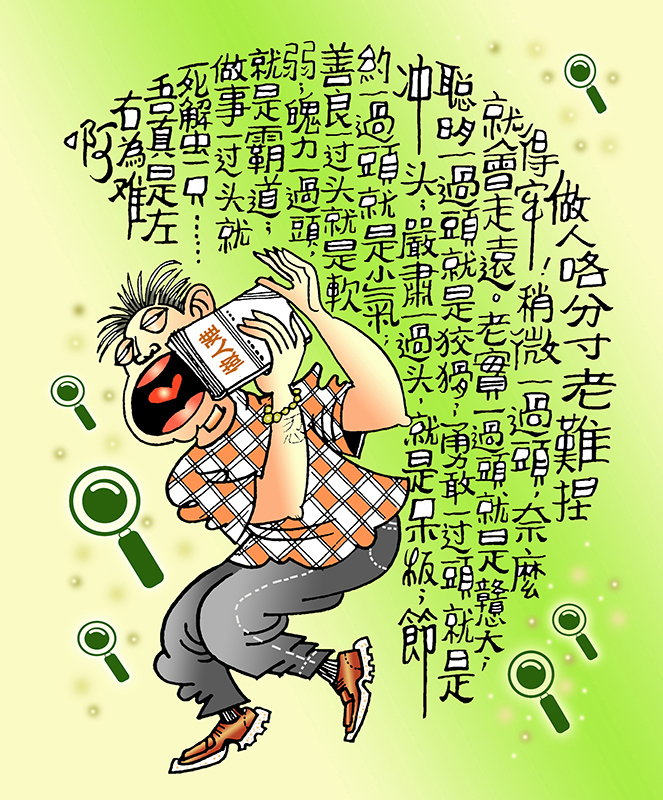做人咯分寸老难捏得牢!稍微一过头,奈么就会走远。老实一过头就是戆大;聪明一过头就是狡猾;勇敢一过头就是冲头;严肃一过头就是呆板;节约一过头就是小气;善良一过头就是软弱;魄力一过头就是霸道;做事一过头就是死蟹一只……吾真是左右为难啊!