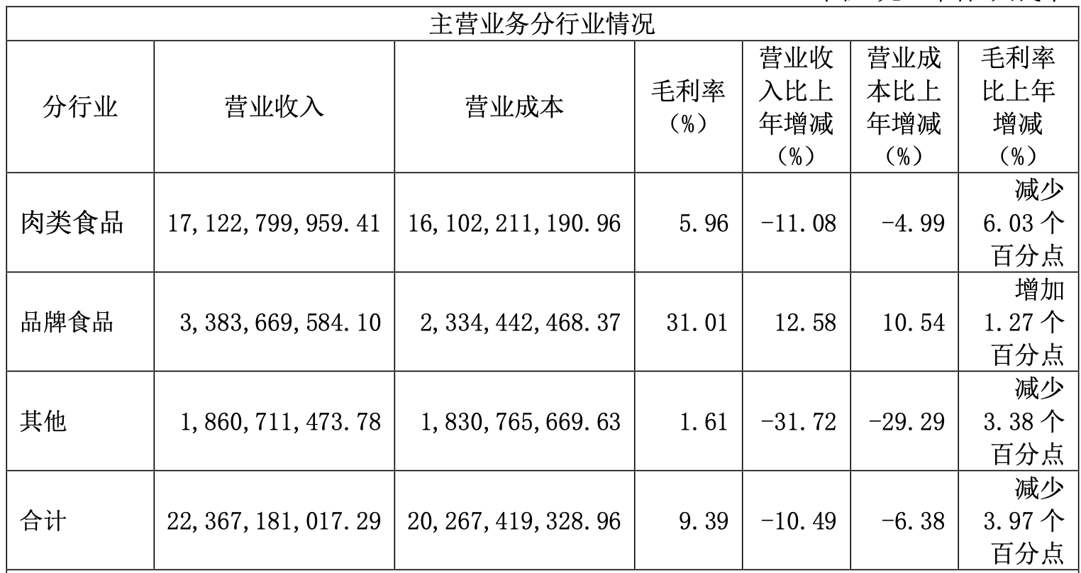 2023年,上海梅林实现营收223.67亿元,同比下降10.49%;实现净利润2.26亿元,同比下降55.13%。其中,肉类食品在营收中占比高达77%,实现营收171.23亿元,同比下降11.08%。