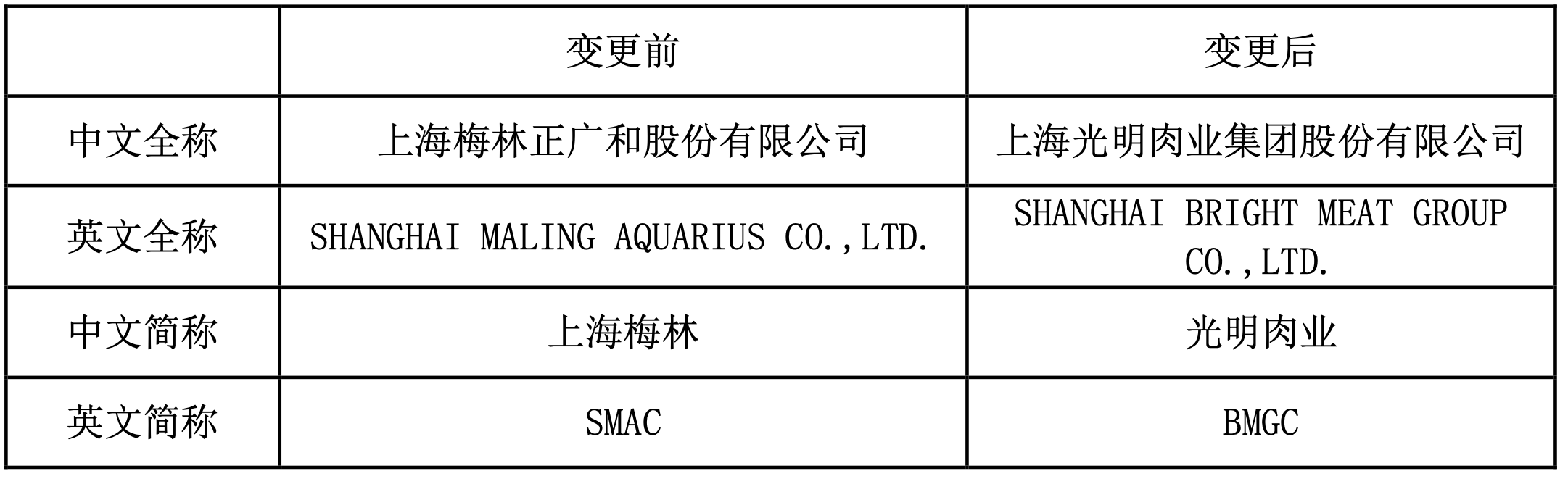 议案称,公司拟变更公司名称及证券简称,将公司中文名称由“上海梅林正广和股份有限公司”变更为“上海光明肉业集团股份有限公司”;将公司英文名称由“SHANGHAI MALING AQUARIUS CO., LTD.”变更为“SHANGHAI BRIGHT MEAT GROUP CO.,LTD.”。同时,拟将证券简称由“上海梅林”变更为“光明肉业”,英文证券简称由“SMAC”变更为“BMGC”。公司证券代码“600073”保持不变。