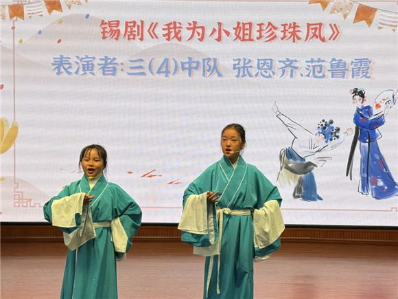 三(4)中队的张恩齐和范鲁霞的锡剧经典曲目《我为小姐珍珠凤》,衣袖飘飘,一招一式演绎出了古风韵味。