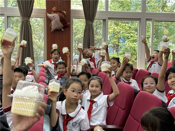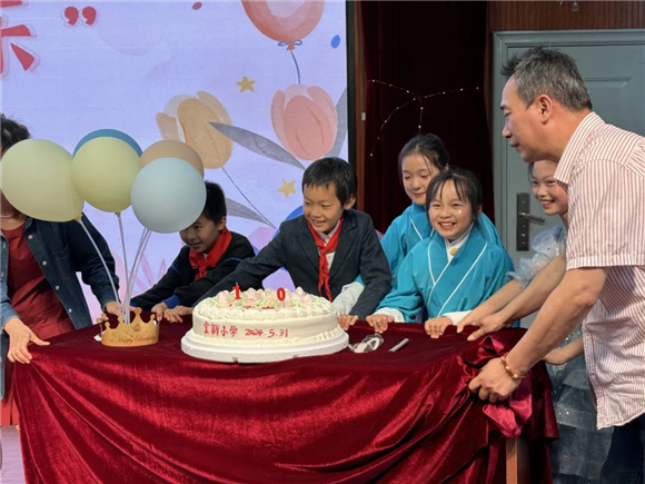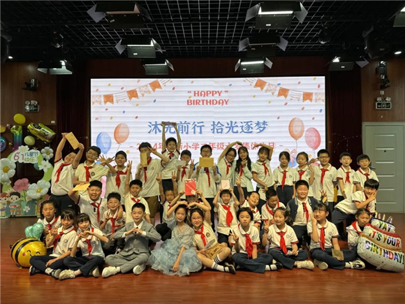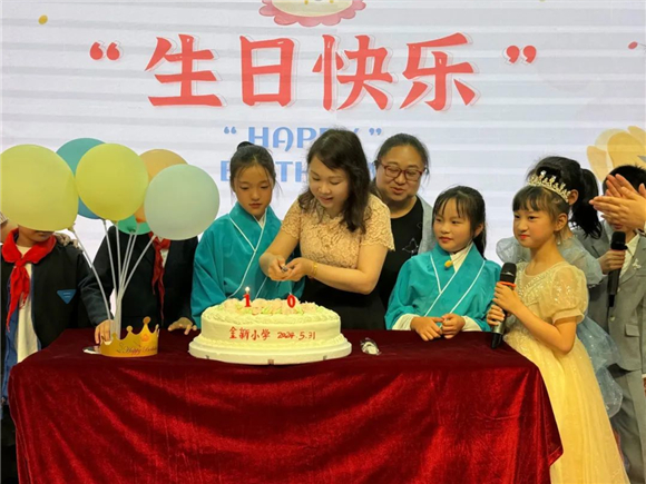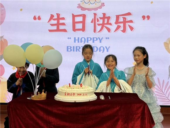 伴随着音乐声响起,一个大大的生日蛋糕被缓缓推上舞台,全场唱响了生日歌。每一支蜡烛代表着一个心愿、一份祝福。同学们带着对未来的憧憬和期待,共同点燃了生日蜡烛,许下自己十岁的生日愿望。