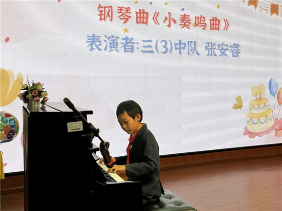 三(3)中队的张安睿的钢琴曲《小奏鸣曲》,琴声悠扬,美妙的音符从指间流淌而出。