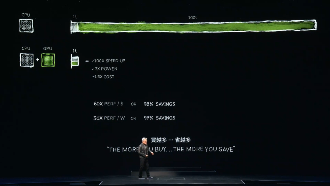 谈到英伟达的核心产品芯片,黄仁勋再次重申“买越多、省越多”。黄仁勋表示,计算机行业在中央处理器(CPU)上运行的引擎,其性能扩展速度已经大大降低。然而,需要处理的数据“继续呈指数级增长”,如果保持原状,人们将不得不经历计算膨胀和计算成本的提升。