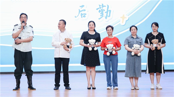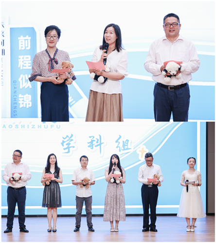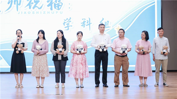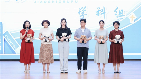 随后,陪伴同学们奋斗三年的任课老师们逐次亮相,每个学科组都做了非常有学科特点的发言,引来同学们的阵阵掌声和欢呼声。学生代表为老师们献上了由学生公司制作的东昌纪念熊,以此感谢老师三年的陪伴。同时,学校的职工代表也上台接受来自同学们真诚的感谢,感谢他们在紧张的高三学习背后的默默奉献。