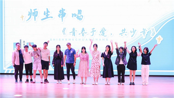 林羽扬、张智楠、龚宇飞、闫佳路、钱璟、陈思佳、张昊文、陶悦萌、沈家瑶以及刘炎平老师、顾超老师、刘佳仪老师带来了师生合作串唱《青春予爱共少年》,在热烈的欢呼声中拉开了典礼的第一篇章。