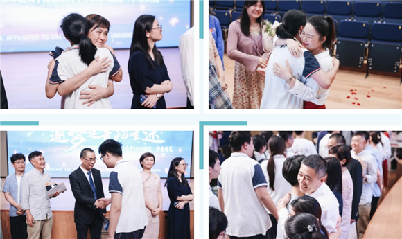 老师们沿着舞台站开,用满腔的爱编制成路,与同学们一一握手、拥抱、说一句“毕业快乐”。不舍与骄傲揉成泪水,送同学们向未来出发。