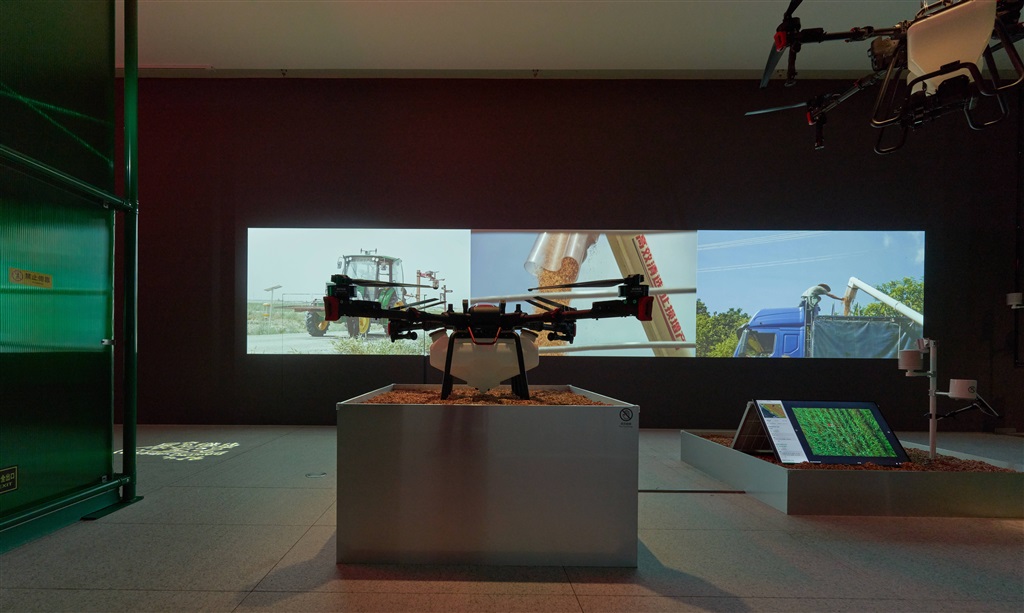 在本次展览中,曹斐正在进行中的最新项目《疾飞》(暂定名)首次与观众见面。影片为大家呈现一种新型的“农业未来主义”。这是一种“无人”的农业,由天空中盘旋的无人机与地面上耕作的机器人共同完成。曹斐以此形式在这种未来主义与人类的古老传统之间建立起新的连接,预计整个项目将在2025年完成。