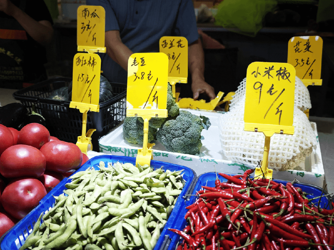早上来到盛德邻里中心一楼,近1600平方米的菜场集市区域,多种蔬菜刚刚上架,红绿相间看上去十分新鲜,包菜0.8元、西红柿、黄瓜1.5元、生菜1.9元、香芹3元……蔬菜的价格诚意十足。中心负责人介绍,近日,一楼菜场集市也在进行部分商铺优化调整,预计8月底将完成调整,但蔬菜摊位仍将继续以自营的方式保持微利让利的做法。