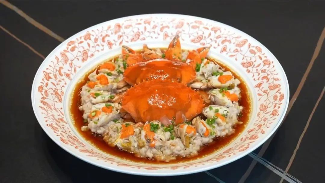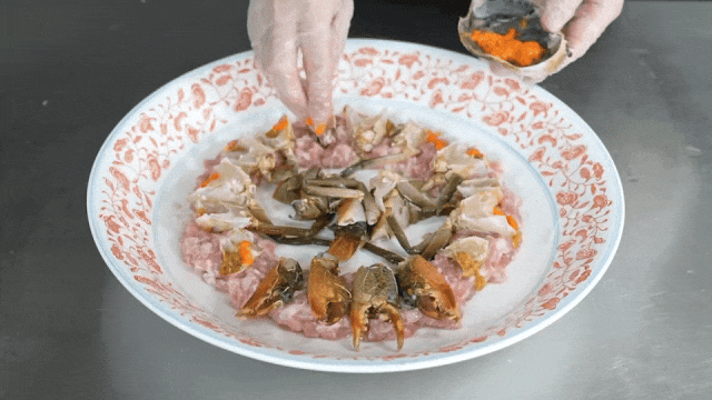 第三步:将拌好调味的黑毛猪肉丁均匀地摆放在蒸盘中,将切好的膏蟹放在肉丁上方,随后放入蒸箱中火蒸约八分钟,直至食材熟透