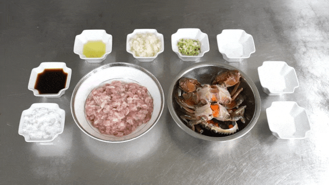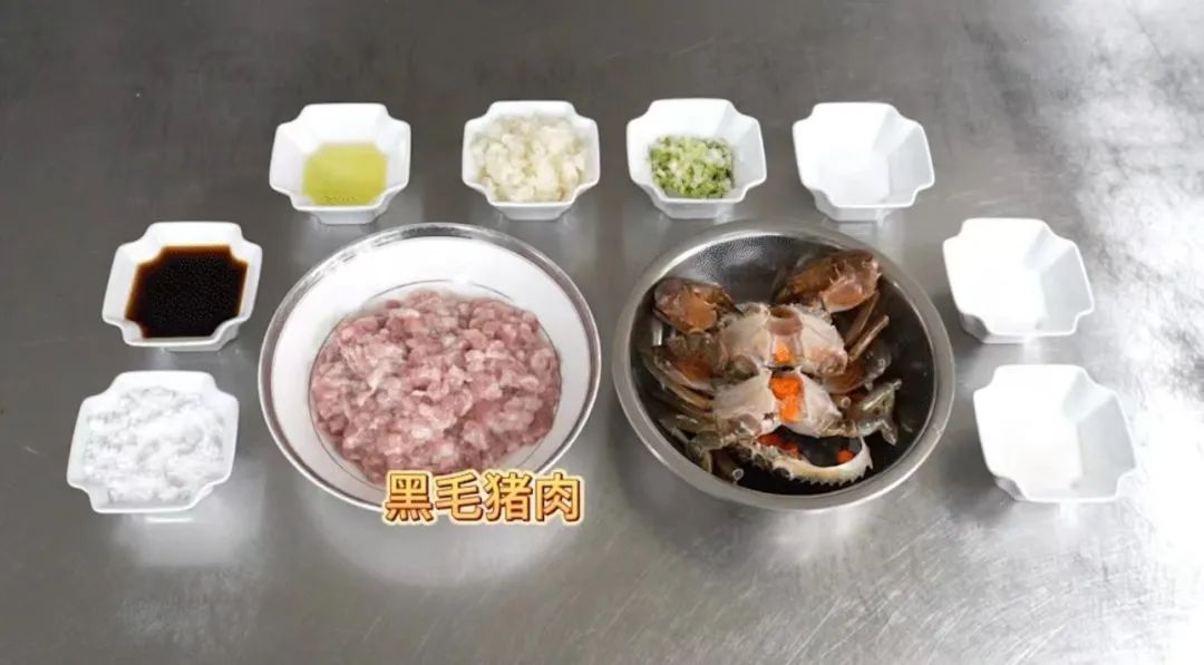 准备食材:新鲜膏蟹两只、黑毛猪肉八两、马蹄、鸡蛋清一个、糖、盐、味精适量