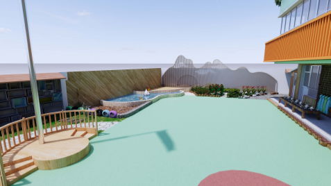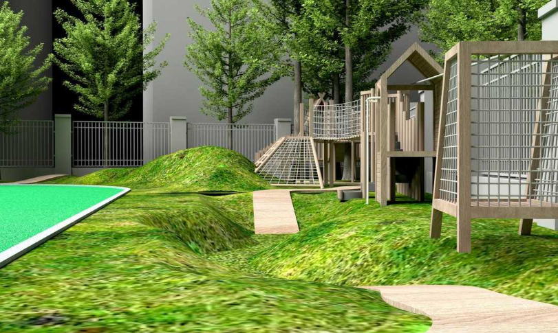 给“一览无遗”来个“大刀阔斧”,幼儿园计划调整园部树木种植的位置,移除原有的矮灌木丛,铺设能让孩子们撒欢的大片草皮;拆除老旧滑梯,分解成能重新游戏的散件;打通室内外环境,拆除一楼阳台的隔断,变成开放式大平台,兼顾遮阳休憩和收纳整理的功能切换;利用材料差异和空间错落,使原有地貌变“山川”,再铺上石板小路、穿插爬藤绿植、设计泥沙水共玩等,为幼儿提供无限探索可能。