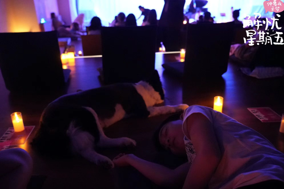 一架三角钢琴、21只颂钵,还有溪水鼓、海浪鼓、仙人掌雨棍、风铃……在熟悉的钢琴旋律中,海浪冲刷沙滩的声音、小溪流过山林的声音、小雨落在树叶和草地上的声音若隐若现,静谧而舒缓。观众脱掉鞋子后,在摇曳的烛光映照下,轻松惬意地或坐或半躺,在爱宠的陪伴下,放空思绪,和着大自然的韵律,静享钢琴家封颖和三位钵体疗愈师带来的75分钟解压之旅。