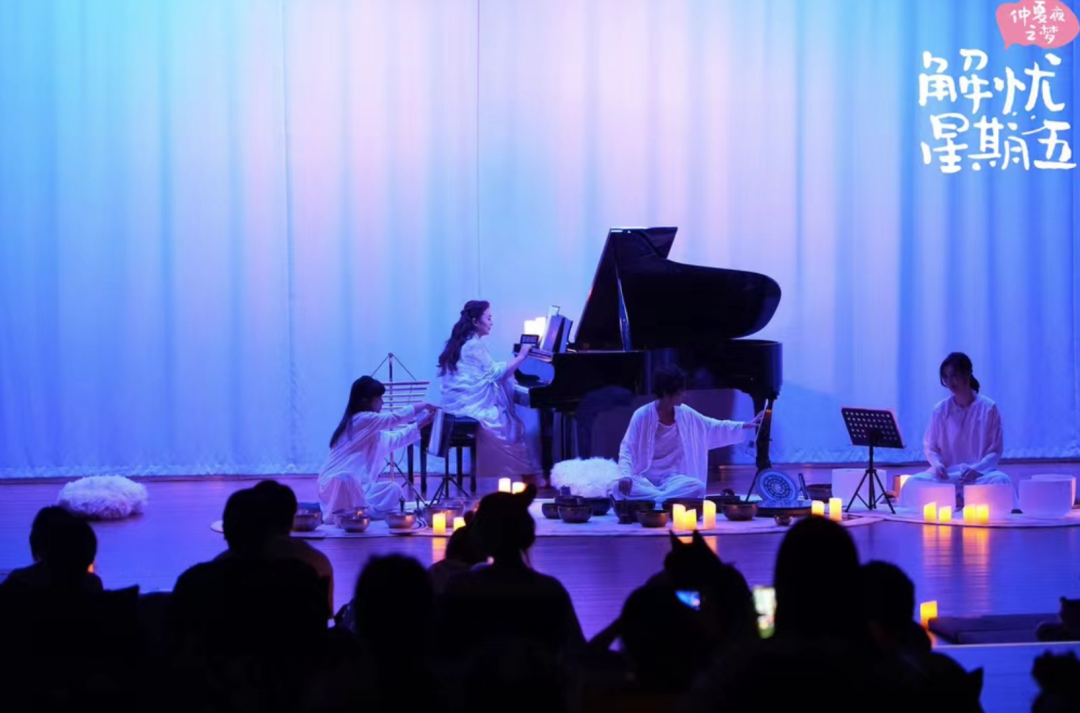 “解忧星期五”是全国首个钢琴+颂钵+N的音乐会品牌。由TRI第三空间与PUMPKIN SPACE音疗空间共同创办。“我们通过音乐的旋律与钵声的振频,帮助观众释放积压已久的都市焦虑,从绵延的音波中获取宇宙恢宏的正能量。”TRI第三空间负责人颜凌告诉记者,颂钵又称喜马拉雅钵,由金、银、铜、铁、锡、铅、锌七种金属制作而成,被称作“会唱歌的碗”,有颂钵音疗能舒缓压力、释放内在负面能量的说法。