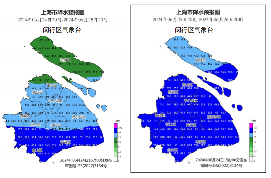 图2:6月24日20时至27日20时逐24小时上海市降水预报图