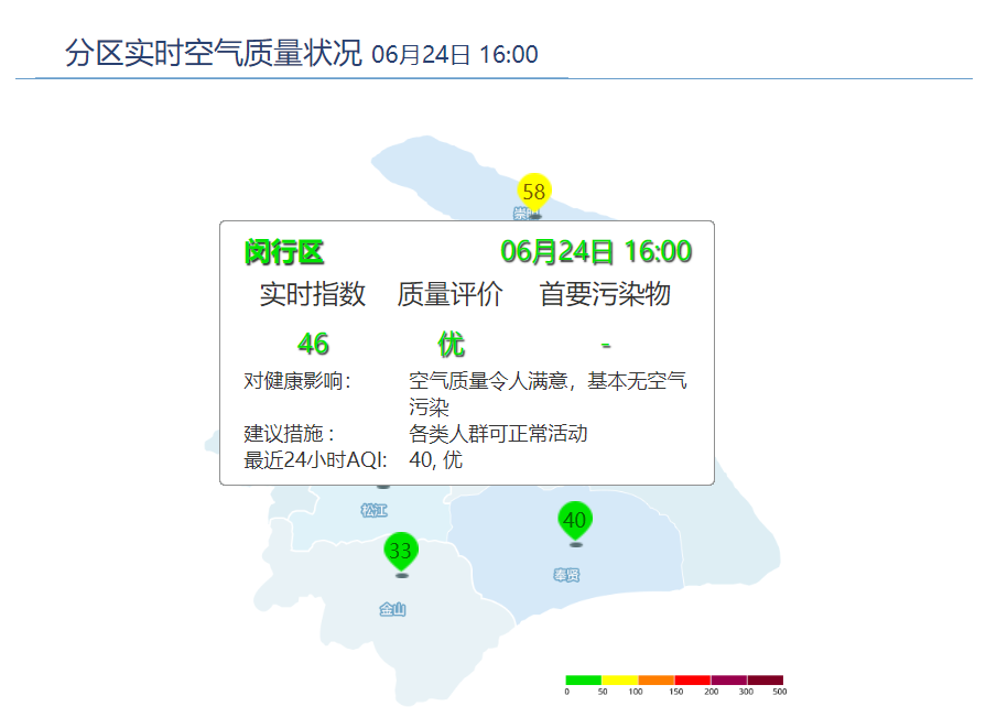6月24日16时,闵行区AQI为46,优。6月23日AQI为28,优。据上海市环境监测中心预报,6月24日夜间优,6月25日上午优至良,6月26日优至良。