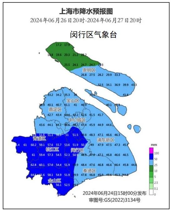 降水:预计25日早晨到27日夜里闵行区有持续强降水,过程累积雨量120—180毫米,其中25日早晨到上午强降水主要集中在南部地区,小时最大雨强20—40毫米;25日夜里到27日小时最大雨强40—60毫米(附图2)。
