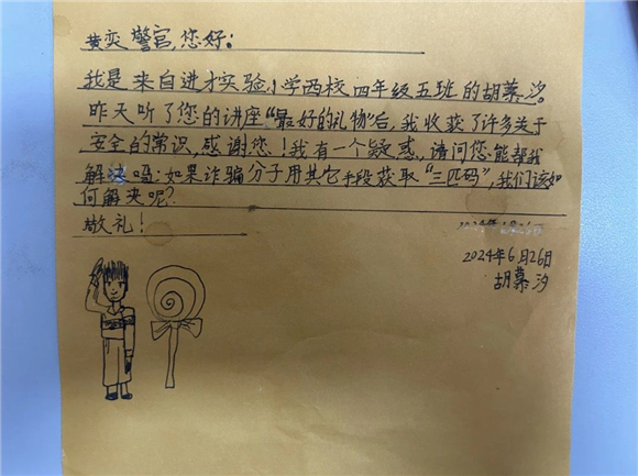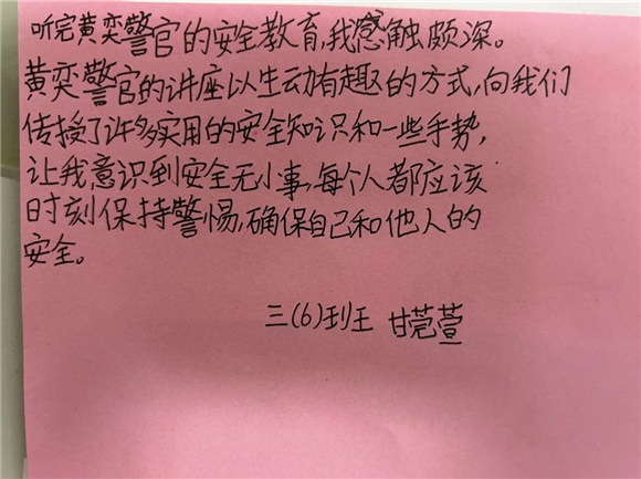 生动的课程结束了,黄奕警官希望同学们能够享受一个安全愉快的暑假的同时,也学会如何更好地保护自己,提高自我保护意识和应对能力。相信本次安全教育主题课程,每位同学都将迎来一个快乐、安全、又充满希望的暑假!