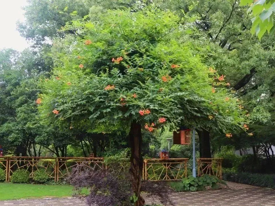 在古代,文人们常借描写凌霄花来表达自己高洁远大的志趣;而今天,凌霄花作为一种著名园林花卉,广泛分布在城市各个角落。