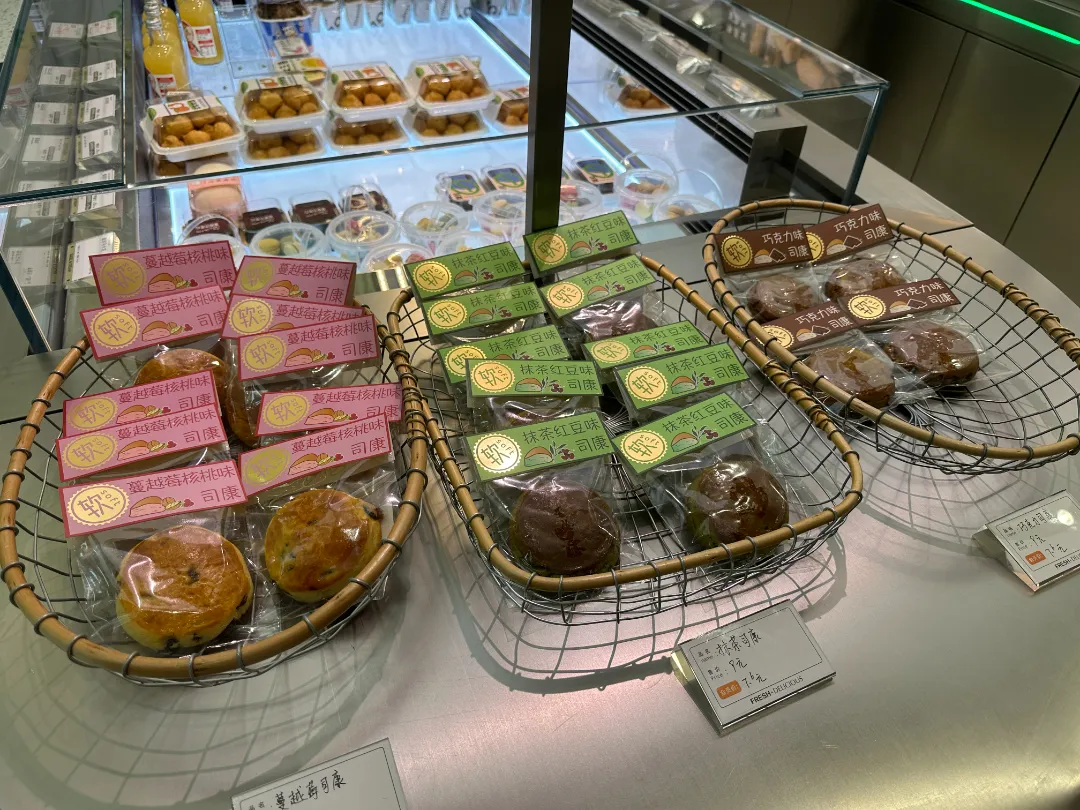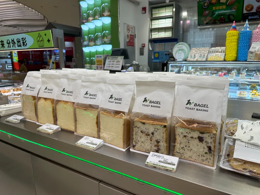 据店员介绍,店内有几大特色产品。最大的特色产品是贝果,用的是进口的面粉,吃起来更有稻香味;另一个特色产品是生吐司,也是用了进口的面粉,做出来有别于传统吐司,吃起来更湿软一点;还有一个特色产品是大米面包,是大米和面粉融合制作出来的,有着浓浓的米香味。