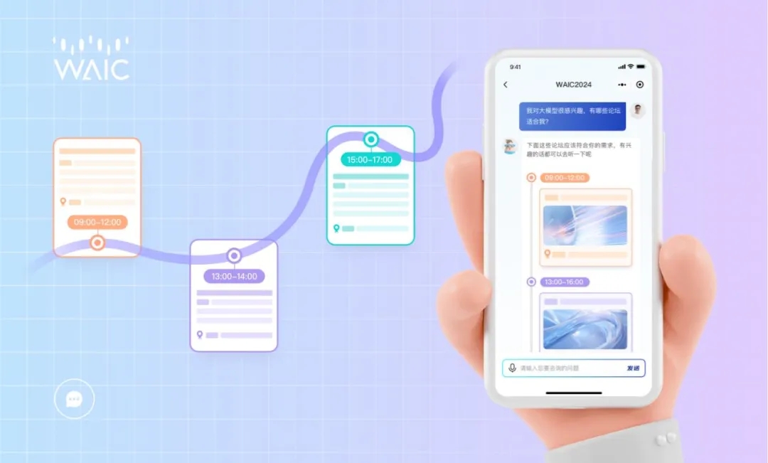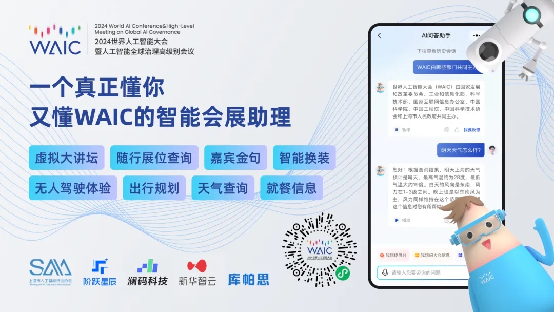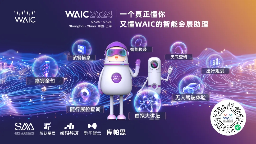 WAIC 2024将于2024年7月4日开幕。为增强嘉宾和观众的观展体验,享受这场学术和科技的盛宴,今年,大会官方推出超级会展智能体——WAIC AI Agent智能会展助理,基于前沿的大模型技术,为嘉宾和观众带来前所未有的便捷与个性化服务。