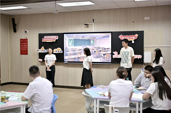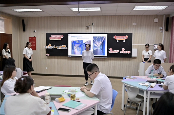 第五小组以“场域文化”为主题,回顾了各小组通过建平实验中学灰黄相间的辉煌广场、数字化设计的科技长廊、倾听心声的心灵港湾、蕴含历史的思源广场、校训墙等育人空间,探索物我对话,开展跨界协同的研修活动,从活动中见习教师们体会到物我对话让景观变灵动、有生命,场域育人让教学有内涵、更多元。