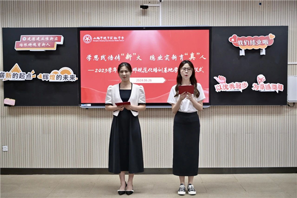 2024年6月26日,2023学年见习教师规范化培训结业仪式在上海市建平实验中学未来教室顺利举行。来自6所学校不同学科背景的22位见习教师相聚于此,结业仪式由教师发展中心精心策划。回望这一年,是每一位见习教师从学生身份转化为教师身份的革新之年,是将所学的教育理论和专业知识付诸现实的实践之年,也是教坛新苗漫长教育生涯的开端之年,更是所有教师筑梦育人、播种希望与梦想的启蒙之年。