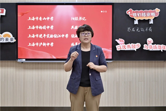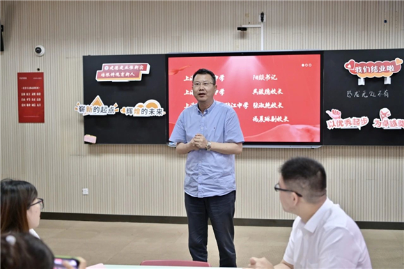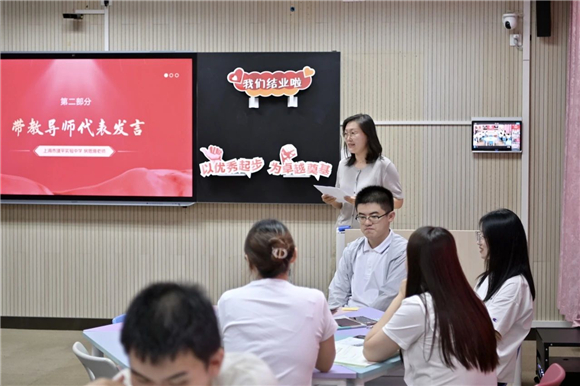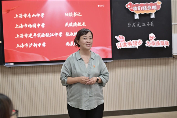 上海市建平实验张江中学党支部书记兼校长张淑艳感谢见习教师规培基地学校提供的优质平台和领导、老师团队的用心付出,同时感谢三位老师克服了工学矛盾,取得了跨越式成长,也体现了见习规培的成效。张校长指出,浦东教育的人才培养始终重视青年教师的成长,这将为为浦东教育事业带来充满活力与希望的未来。最后张校长鼓励大家,携手并进、保持热爱、逐梦远航。