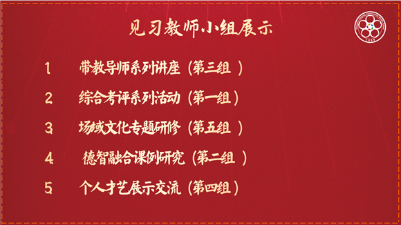 本场结业仪式包括见习学员代表发言、带教导师代表发言、见习教师小组展示、聘任学校领导点评、基地学校校长寄语、结业证书与奖品颁发等多项议程。