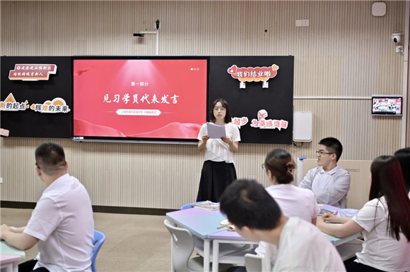 上海市沪新中学冯晨琳副校长首先对上海市建平实验中学给见习教师提供了一个全面和系统的学习平台表示感谢,在为期一年的见习规培活动中,看到了大家通过浸润式学习养成了教育教学规范。冯副校长期待见习教师们要有文化的思维和迭代的思维,让个人成长和学校办学理念紧密链接、同频共振,教师的专业发展只有“进行时”,没有“完成时”,愿老师们经由终生学习更好地教书育人。