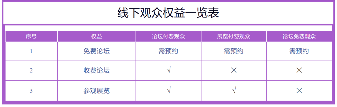 公众可通过云平台进行注册报名,登记完整信息后,免费或付费参与线下大会。线下观众具体分为论坛免费观众、论坛付费观众、展览付费观众三大类,不同观众身份及权益如下: