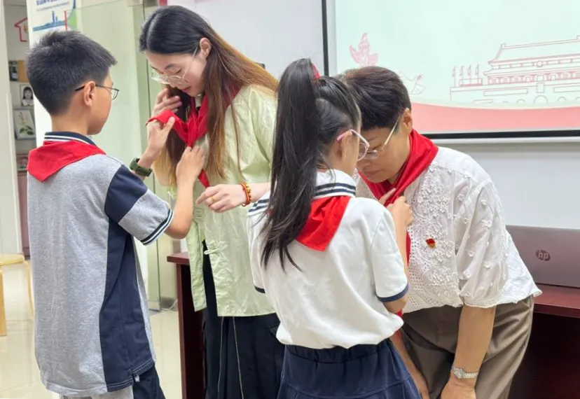 紧接着,来自上海师范大学附属宝山实验学校的老师为大家详细介绍了党旗的由来及含义,让孩子们深刻理解了党旗所承载的历史意义和精神内涵。同时,老师还现场教授了红领巾的正确佩戴方式,让孩子们在亲身体验中感受红领巾的神圣和庄重。