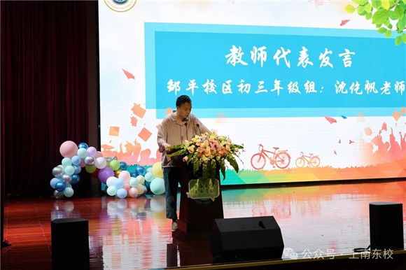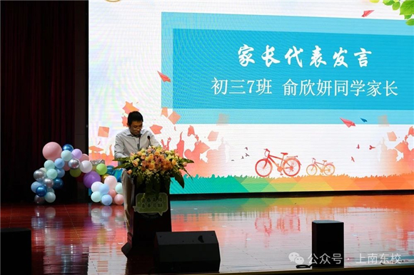 初三7班俞欣妍同学的父亲作为家长代表上台发言。他向在这四年中辛勤付出的上南东校老师们致以了崇高的敬意和最诚挚的感谢。