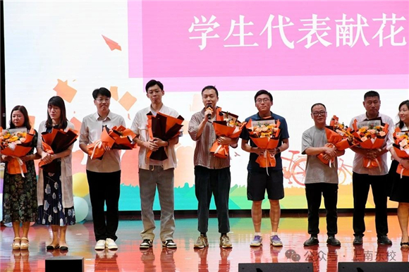 而当全体初三教师缓步走上舞台,现场立即爆发出热烈的掌声。优秀毕业生代表们纷纷上前献上鲜花,每一束花都寄托着他们对恩师们深深的感激与崇高的敬意。