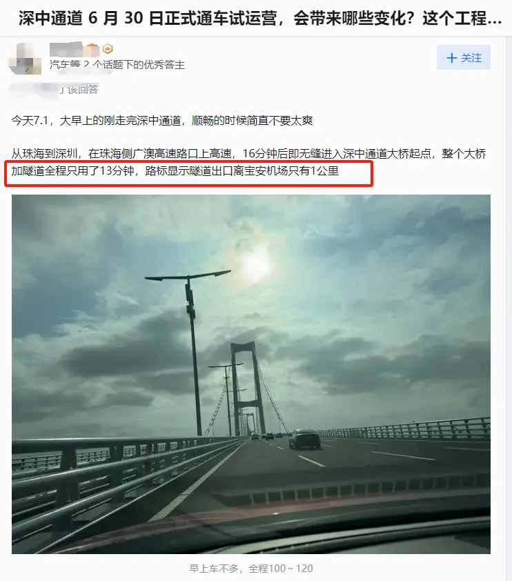 通车次日早上,就有网友实测,发来反馈:“从马鞍岛上桥,到深圳出口,通行时间仅约需15分钟!”