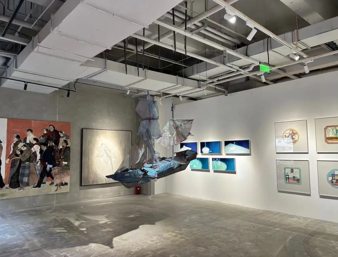 靠近入口处悬挂着的《愚人船》出自本科毕业生翟庆喜之手。以欧根纱包裹骨架,以粗线缝纫船体各板块。“我为这艘船高高的桅杆点上一盏小灯,愿这艘探寻真理的船只收留漂泊的旅人,愿它成为漆黑水域上的故乡。”作者这样介绍。