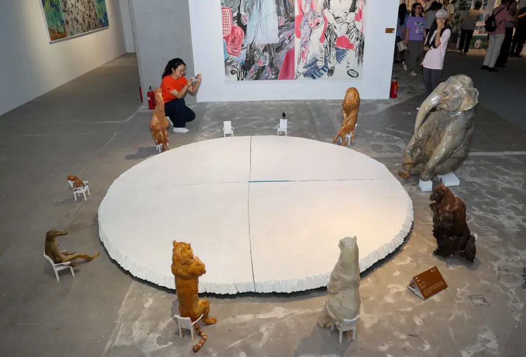现场还有一个名为《动物会议》的作品引起记者注意。只见大象、豹子、八爪鱼等动物围坐一团,大家分别坐于一张张小椅子上,仿佛在开会。据介绍,这是出自雕塑美术专业的研究生毕业生周峰的作品,他用拟人的手法将动物形象置于身边,通过构筑这样一个场景来表达生命之间的平等,同时也反映当今世界动物与人类社会的碰撞与摩擦。作者同时也在思考生命的根本——生与死的话题,希望作品能够为动物保护和环境保护贡献一份力量。