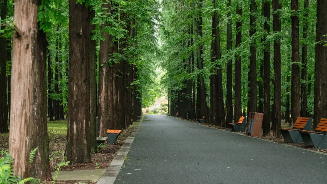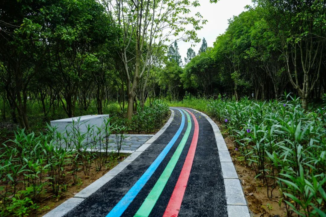 走进这处新建成的东田村开放休闲林地,一眼邂逅的“薄荷曼波”轻盈地雀跃在这片乐土上。林子里草木葳蕤、种类繁多,有香樟、落羽杉、蓝花草、山桃草、狗尾巴草等,新建的蓝绿红三色步道蜿蜒绵亘、曲径通幽,沿途还设置了logo景墙、休憩座椅、自然课堂、观景平台、景观廊架、地图标识、照明设施等,方便人们休闲游憩和寓教于乐的需求。