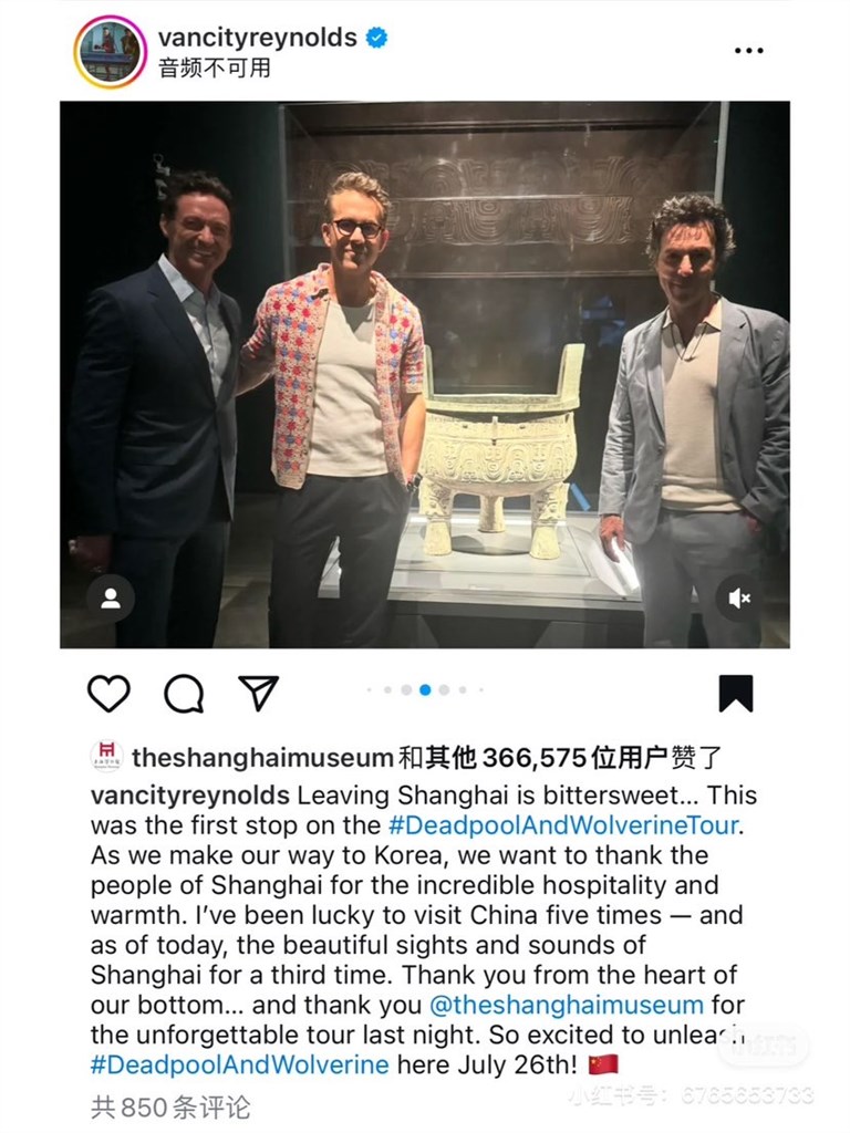 漫威电影《死侍和金刚狼》主创团队导演肖恩•利维(Shawn Levy)、主演“死侍”瑞安•雷诺兹(Ryan Reynolds)以及“金刚狼”休・克曼(Hugh Jackman)打卡上海博物馆东馆,并与馆藏大克鼎合影。虽然三人访问时间短暂,但对三千多年前的中国青铜器—大克鼎表现出的浓厚兴趣。瑞安•雷诺兹还发布帖文表示特别感谢上海博物馆提供的难忘游览。