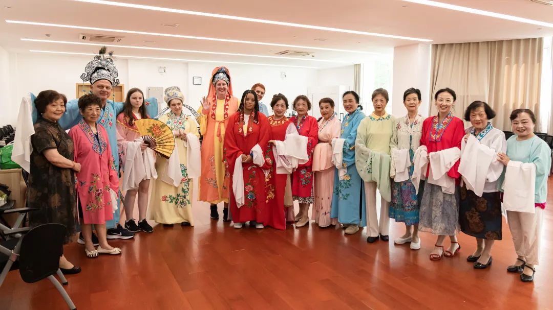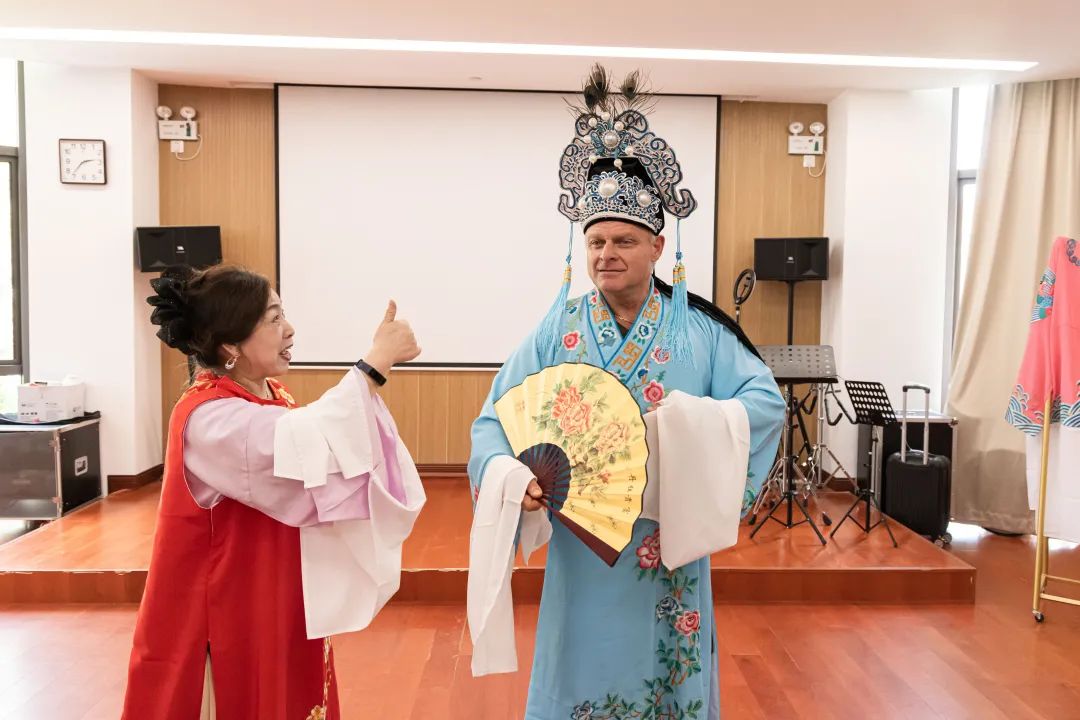 在曹杨社区,20名外国师生参观了曹杨新村村史馆和曹杨一村,深入了解曹杨社区的历史与发展,深刻感受到“老村”焕“新颜”的变化。在听到讲解说“曹杨新村是中国第一个工人新村”时,法国、英国领队连声惊叹“fantastic”,为这个示范村建设竖起大拇指。在曹杨社区文化活动中心,武术展示、卢氏心意拳、越剧换装、梅花绳结书签等体验活动,则让外国友人感受到独特的文化魅力。越剧作为国家级非物质文化遗产,唱腔优美动听、表演真切动人,瑞士领队在观看越剧老师的表演后,情不自禁地学唱,并申请为他换上越剧服装。在老师的指导下,领队们和老师共同上演了一段创意越剧表演,领队们风趣幽默的表现力让全场欢笑声不断。