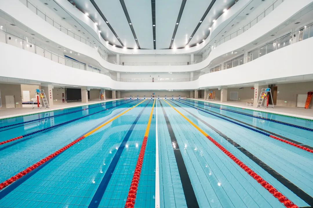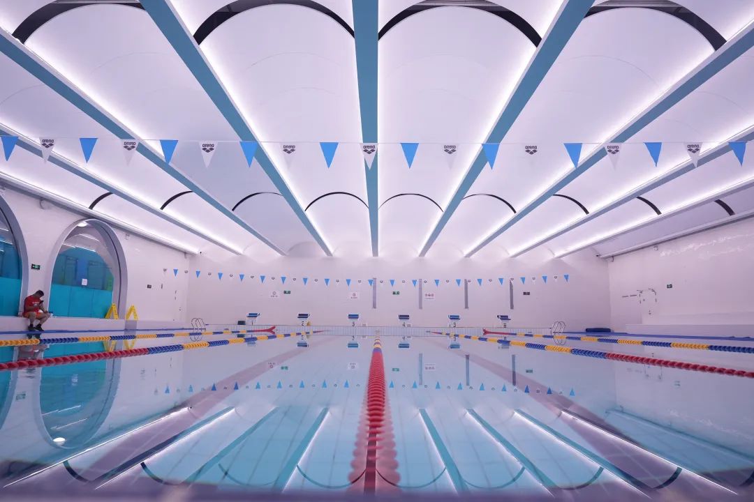 升级改造后的上海游泳馆,场馆干净明亮,标准泳池附近波浪形设计、入口门厅的旋涡和休息等候区的涟漪设计,把“水”和“海洋”的元素,融入到了建筑当中。整个场馆以清新简约的白色为主,配以蓝色的泳池,把大量的阳光引入室内,显得明亮通畅。