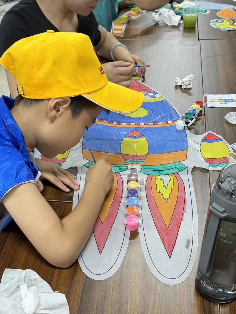 随后,孩子们纷纷拿起画笔,沾上颜料,在空白的风筝上尽情挥洒创意。他们或低头沉思,或互相讨论,每一个细节都倾注了他们的心血和想象。不一会儿,一只只形态各异、色彩斑斓的风筝便在他们的巧手下诞生了。孩子们在家长和志愿者的陪伴下,迫不及待地来到广场上放飞自己亲手制作的风筝。学生章依潼说:“自己做的东西比买来的更有意义,颜色可以自行搭配。”