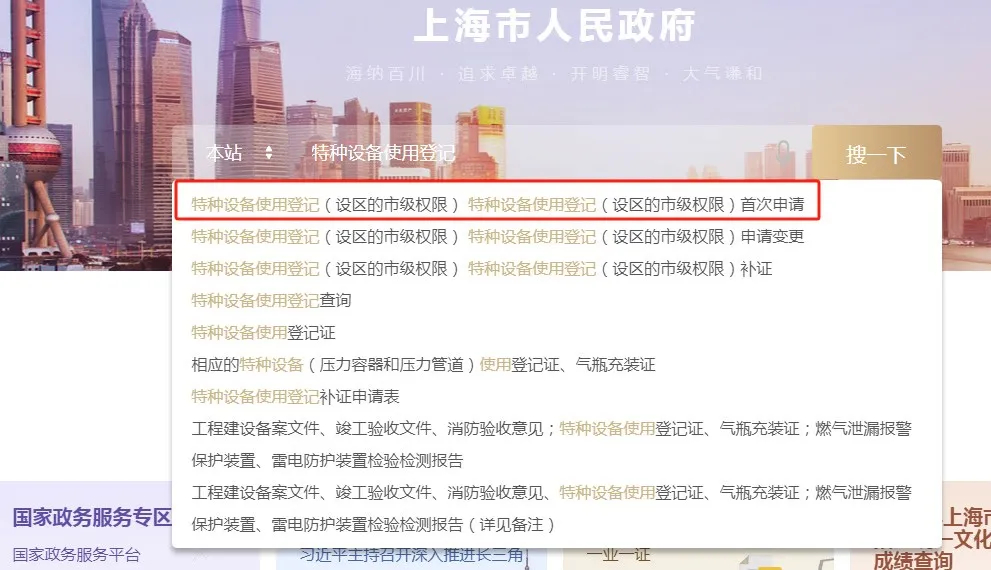 在“一网通办”首页搜索框输入“特种设备使用登记”,选择“特种设备使用登记(设区的市级权限)首次申请”,地区设定为“宝山区”,随后点击“立即办理”。系统将自动跳转至相应业务办理页面,请按提示完成后续操作。